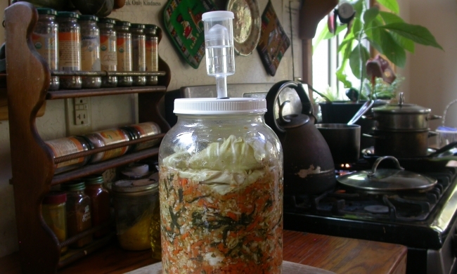 Dress up your Sauerkraut with more flavors and it will be Kimchi. My favorite combination is green cabbage, carrots, broccoli, kale, red pepper, onion, garlic, sea palm fronds or hijiki (see veggies), tumeric, Himalayan Sea Salt, and FriendlyForce Probiotics.